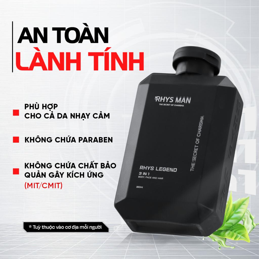 Rhys Legend 3in1 là sản phẩm tích hợp 3 công dụng trong 1: sữa tắm – dầu gội – sữa rửa mặt, giúp tiết kiệm thời gian nhưng vẫn đảm bảo hiệu quả làm sạch tối ưu.